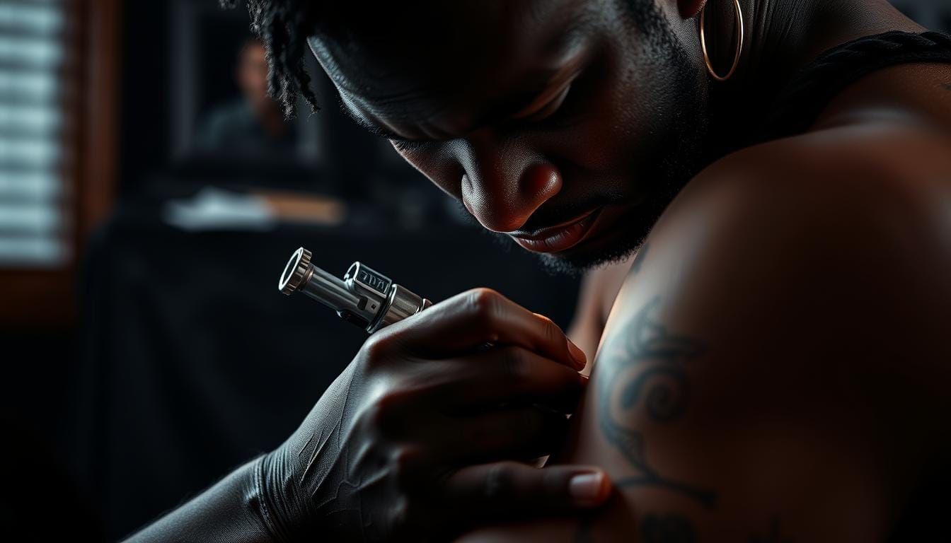 Now, contemporary black tattoos share your story, beliefs, or big moments. Artists like Chris Christensen and Amorpha Studio lead in modern tattoo art. They use bold lines to show feelings.